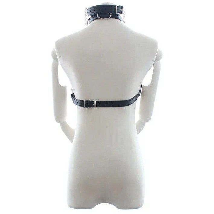 Стильный аксессуар на зону лифа подчеркивает красоту женской груди. Модель отличается сдержанным, минималистическим дизайном. Тонкие ремешки из экокожи соединены между собой кольцами и декорированы заклепками. Вся металлическая фурнитура выполнена из материалов высокого качества. Хорошая посадка по фигуре обеспечивается благодаря регулируемым ремешкам.