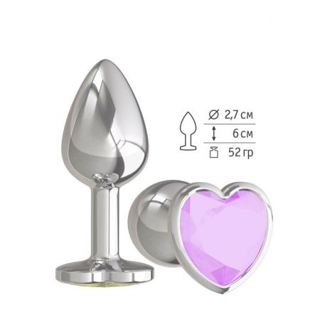 Металлическая анальная втулка «Silver» с сиреневым кристаллом-сердцем, цвет серебристый, Джага-Джага 514-13 LILAC-DD