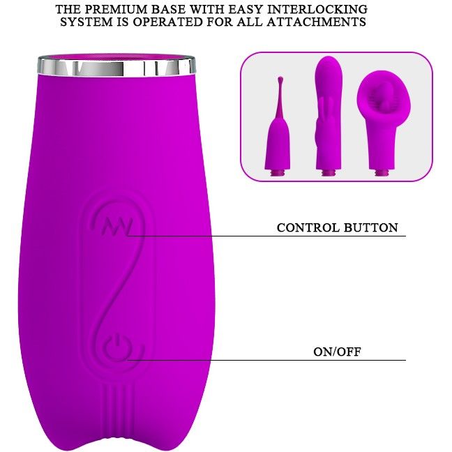 Оригинальная секс-игрушка с разнообразными насадками и большим количеством виброрежимов. Может использоваться для стимуляции эрогенных зон во время прелюдии или при половом акте. Насадки накручиваются на основание интимного аксессуара. Включение/выключение/переключение виброрежимов осуществляется с помощью кнопок на корпусе изделия. Выберите одну из насадок, и пусть уникальная форма каждой из них привнесет в вашу игру новый опыт. Исследуйте диапазон интенсивности, испытав многоскоростную вибрацию. 12 режимов вибрации. Аккумулятор перезаряжаемый, USB-кабель для зарядки в комплекте. Секс-игрушка изготовлена из гипоаллергенного, мягкого и приятного на ощупь материала. Не требует сложного ухода. Совместно с эротическим аксессуаром рекомендуется использовать лубрикант на водной основе и очищающий спрей с антимикробным эффектом для экспресс-обработки. Длина ручки - 7.5 см.