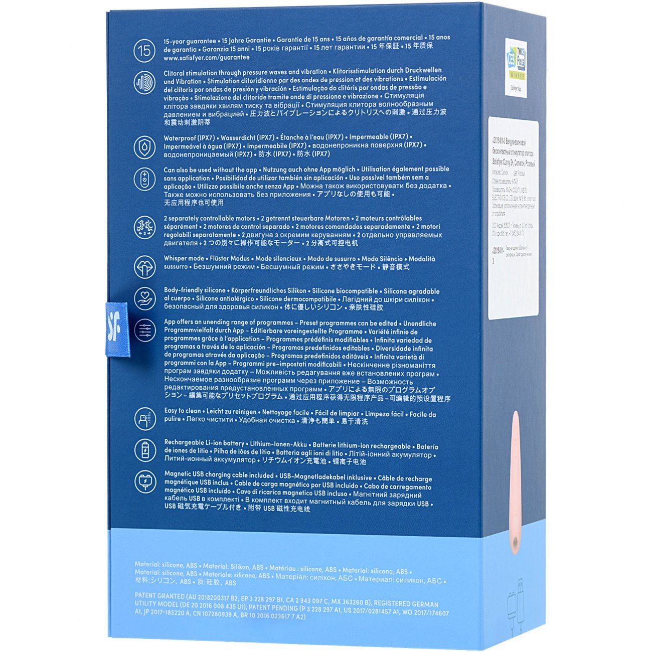 Вакуумный стимулятор Satisfyer Curvy 2 - это улучшенная версия флагманского стимулятора Satisfyer Pro 2, дополненная вибрацией и возможностью управления через смартфон. Игрушка идеально повторяет изгибы вашей руки, а изготовленный из медицинского силикона корпус обладает гладкой, приятной на ощупь поверхностью. Округлая головка плотно прилегает к клитору и надежно "захватывает" вибрации, чтобы с точностью передать ее телу. Откройте новые возможности с Satisfyer Connect! Подключите девайс к смартфону и исследуйте новые возможности управления. Приложение доступно в AppStore и GooglePlay. Заряжается устройство с помощью магнитного кабеля, входящего в комплект. До и перед каждым использованием головку игрушки желательно промыть под проточной водой и обработать дезинфицирующим средством. Стимулятор можно помыть в теплой воде с мылом или воспользоваться специализированным чистящим средством. Перед хранением стимулятор необходимо хорошо просушить. Храните отдельно от других силиконовых изделий. Общая длина: 14 см. Внутренний диаметр раструба: 1.5 см х 1.5 см. Вес: 121 гр. ВНИМАНИЕ! Устройство обладает уровнем водонепроницаемости IPX7, позволяющее кратковременное погружение на глубину до 1 м длительностью не более 30 минут; при кратковременном погружении вода не попадает в количествах, нарушающих работу устройства. Постоянная работа в погружённом режиме не предполагается. Долгосрочная работа ПОД ВОДОЙ не предполагается. Гарантия от производителя – 15 лет. Гарантийное обслуживание с покрытием транспортных расходов через магазин – в течение 1 года. Последующее гарантийное обслуживание осуществляется также через или официальный сайт производителя, но транспортные расходы заявитель оплачивает отдельно. Сохраняйте упаковку с серийным номером до конца гарантийного срока. В гарантийных случаях напишите нам на электронную почту отдела рекламации , указав номер заказа и коротко описав проблему. Гарантия распространяется только на компоненты, которые влияют на функционирование изделия. Она не распространяется на внешние изменения, вызванные естественным износом или повреждениями, несчастным случаем, неправильным использованием или небрежным обращением. Кроме того, гарантия не действует в случае несоблюдения указаний по эксплуатации или сборке. Также из гарантии однозначно исключается аккумулятор, входящий в комплект поставки. Любая попытка открыть или разобрать продукт (или его аксессуары) приведут к аннулированию гарантии. Кроме того, действие гарантии прекращается при ненадлежащей установке или вводе в эксплуатацию, повреждениях из-за действий непреодолимой силы или природных катаклизмов, в частности, наводнений, пожаров, морозов и т.д.