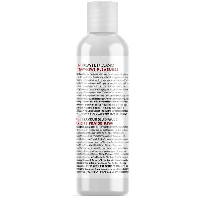 4-в-1 Playful Flavours - игривое удовольствие во всех его проявлениях! Гель от Swiss Navy обладает прекрасным вкусом и насыщенным ароматом клубники и киви, который поможет вам познать всю сладость момента! Потрите или подуйте на место нанесения, чтобы высвободить манящее тепло. Или насладитесь вкусом, добавив гель во время массажа или используйте в его качестве лубриканта. Straw-Kiwi Pleasures 4-in-1 Playful Flavours очарует и пробудит все ваши чувства! Гель можно использовать для разогревающего массажа. Почувствуйте комфортное тепло, испытайте расслабляющие и чувственные прикосновения. Добавление геля к вашим сексуальным играм создает естественные возбуждающие ощущения. Наслаждайтесь оральными ласками со вкусным съедобным гелем от Swiss Navy. Вам хочется, чтобы удовольствие длилось вечно? Шелковистый гель при использовании в качестве лубриканта сделает интимные моменты более комфортными и обеспечит длительное скольжение благодаря стойкой формуле. Каждая ласка и поглаживание с этим гелем будут будоражить вашу чувства. Плавное и легкое скольжение сделает массаж еще более чувственным и приятным. Playful Flavours - это гель 4в1, подходящий для игривой прелюдии, массажа и полового акта. Состав: Glycerin, Deionized Water, Flavor.